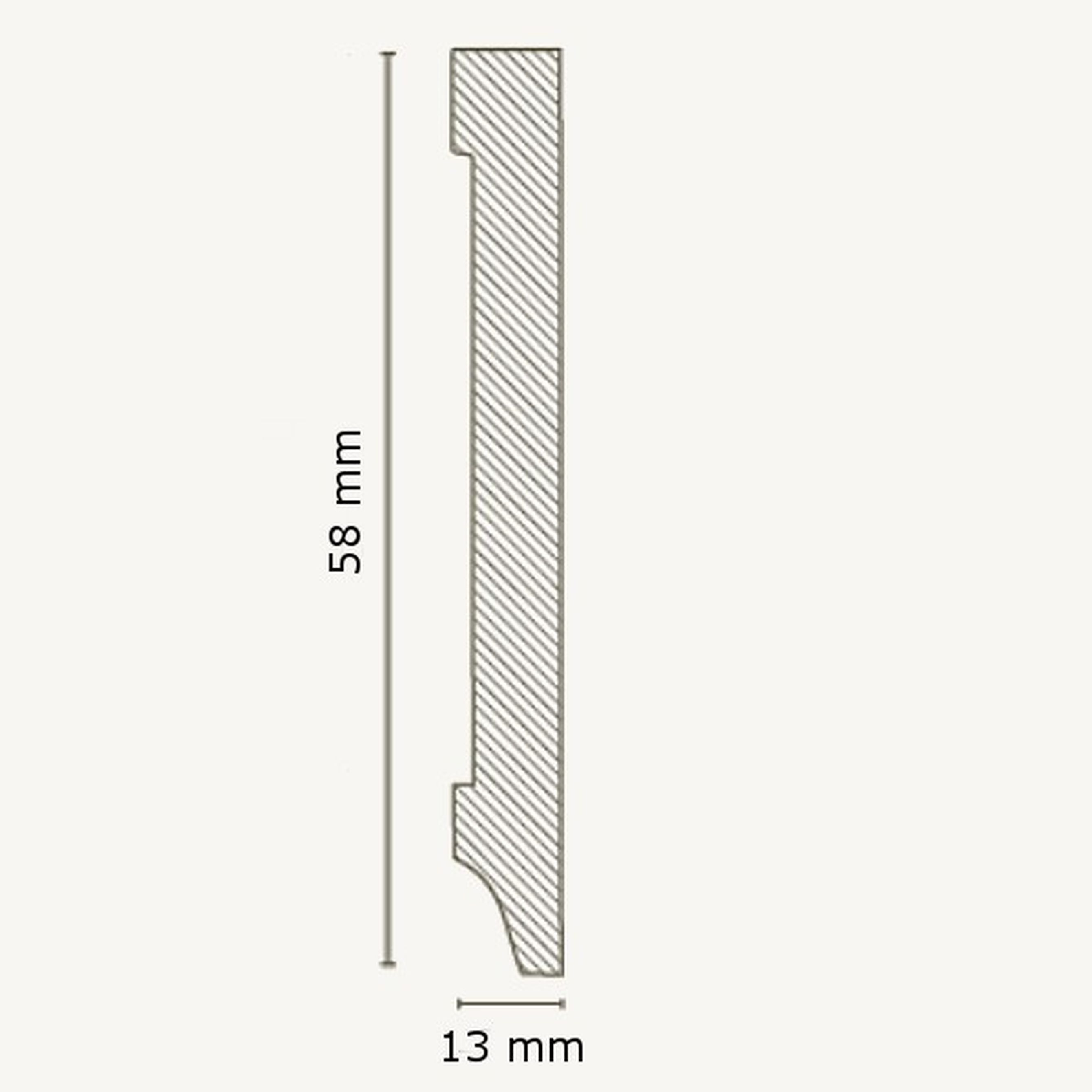 - GRÖSSE: Die Fußleiste mit den Abmessungen 13 x 58 x 2500 mm schafft einen sauberen Übergang zwischen Boden und Wand.